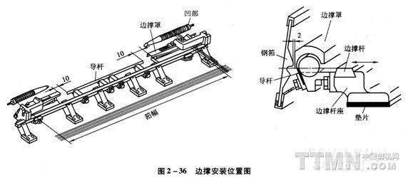 (2)安裝位置(圖2—36):在織機(jī)兩側(cè)各裝一副,具體位置是在邊撐桿的供紗側(cè)和原動(dòng)側(cè)各安裝一副,原動(dòng)側(cè)(右側(cè))一副可沿筘幅方向移動(dòng),以適應(yīng)不同幅寬的織物需要。