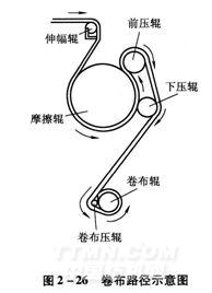 織物先經(jīng)伸幅輥,繞過摩擦輥(卷取輥),再經(jīng)前壓輥,下壓輥,壓布輥,卷到卷布輥上。織物在前壓輥和下壓輥的作用下緊貼摩擦輥,并有大的包角,使摩擦輥對織物有大的握持力,達到均勻準確地將織物引離織口的目的,并滿足不停車落布的要求。