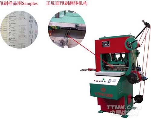 YTP4100B 專門用于布質商標正反面同步印刷。機內設有翻轉機構及烘干設備,但在正反面同步印刷時,由于來不及干燥,速度較慢,印速不能大于2500版/小時。