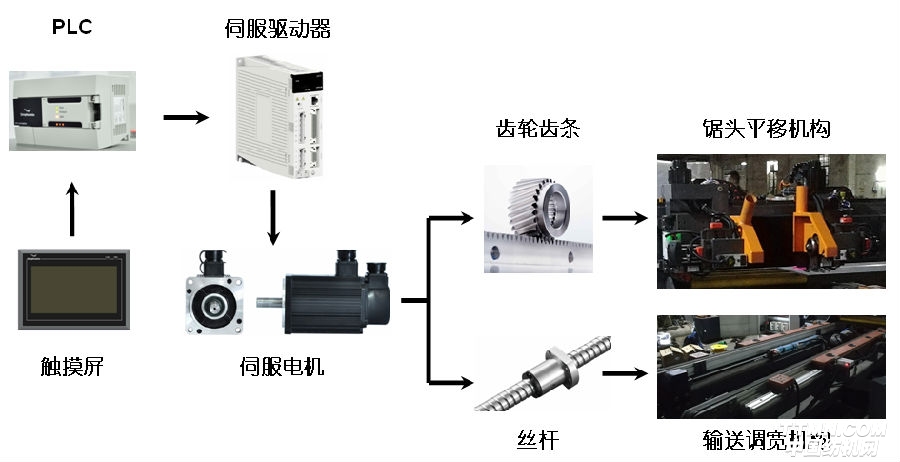 基本工作原理為:四方電氣CA100伺服系統(tǒng)通過齒輪齒條及絲桿分別帶動鋸頭平移機(jī)構(gòu)和輸送調(diào)寬機(jī)構(gòu)。鋸切位置和速度及輸送調(diào)寬的寬度由觸摸屏設(shè)置,通過Modbus通信發(fā)送至PLC,PLC再將位置及寬度轉(zhuǎn)化為控制伺服位置及轉(zhuǎn)速的脈沖信號控制伺服系統(tǒng)運(yùn)行。脈沖的個數(shù)及頻率決定了伺服電機(jī)轉(zhuǎn)動的圈數(shù)(即鋸切位置和寬度)和運(yùn)行的速度。