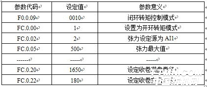 該系統(tǒng)主要介紹收卷控制,收卷控制變頻器工作于閉環(huán)矢量開(kāi)環(huán)張力控制模式,PG卡和編碼器配合用來(lái)實(shí)現(xiàn)變頻器的閉環(huán)矢量運(yùn)行模式,張力設(shè)定源為外部電位器,線速度輸入源為上位機(jī)PLC控制,還有卷徑復(fù)位以及啟動(dòng)信號(hào)均來(lái)自于上位機(jī)。本收卷系統(tǒng)要求變頻器反應(yīng)迅速,變頻器頻率輸出隨線速度變化以及放卷速度還有卷徑變化實(shí)時(shí)快速調(diào)節(jié),并且變頻器的過(guò)載能力要強(qiáng),要求系統(tǒng)反應(yīng)迅速,運(yùn)行平穩(wěn)。