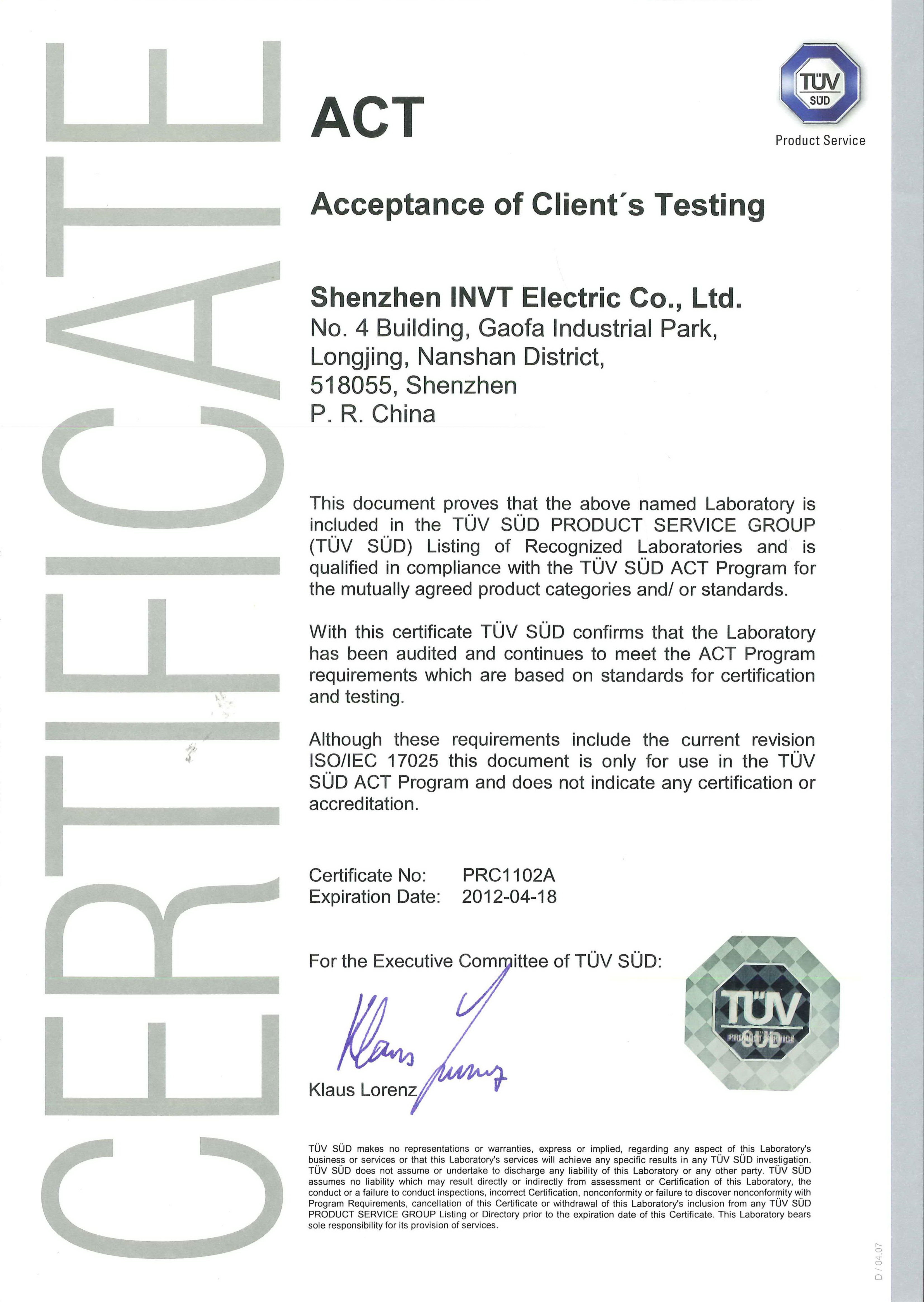 ACT證書全名為Acceptance of Client’s Testing(客戶測試數(shù)據(jù)認可),即德國TÜV SÜD正式承認我司實驗室的技術(shù)水平,正式認可實驗室出具的測試數(shù)據(jù),并接收實驗室出具的測試報告。