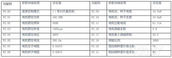 辨識(shí)電機(jī)參數(shù)在電機(jī)軸與負(fù)載脫開(kāi)的情況下進(jìn)行,首先設(shè)定電機(jī)參數(shù)P2.00-P2.05和編碼器參數(shù)P4.00-P4.01,然后設(shè)定 P0.07為1進(jìn)行電機(jī)參數(shù)自學(xué)習(xí),主要的參數(shù)如下: