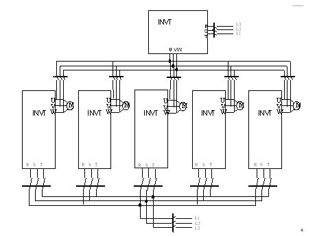 在本次改造中,如前所述,共有五臺壓榨機需改造,選用英威騰公司六臺CHE 560kW 并機型變頻器,五臺使用,一臺備用,其系統(tǒng)接線圖如下: