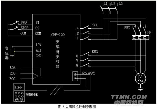 2)在變頻器的硬件上只要通過一條485通訊外接鍵盤,就可制作成兩路面板控制;鍵盤和主板之間可用1200米以內的屏蔽線聯(lián)結,以滿足用戶的要求。保留原風機窯面和值班室兩處的緊急停車按鈕,在空開和變頻器之間的主電路中,增設交流按觸器。用鋼材把原放風閥封牢。變頻改造后要依次合理調節(jié)每一個窯爐風腰的開度。