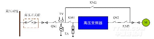 10kV電源經(jīng)高壓開關(guān)柜到高壓變頻器的電源切換柜,經(jīng)高壓隔離開關(guān)QS1、KM1到高壓變頻器的移相整流側(cè),高壓變頻器的調(diào)頻電源經(jīng)高壓隔離開關(guān)QS2及KM3到高壓電機(jī),KM2及KM3彼此電氣互鎖, 但高壓變頻器出現(xiàn)故障時,KM3跳脫,KM2閉合,系統(tǒng)自動切換到工頻電源運(yùn)行,避免高爐因高壓變頻器故障產(chǎn)生風(fēng)口灌渣事故,確保煉鐵生產(chǎn)的持續(xù)可靠運(yùn)行。