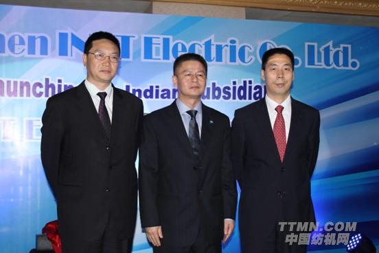左起:中國(guó)工商銀行孟買(mǎi)分行總經(jīng)理孫翔、英威騰董事長(zhǎng)兼總經(jīng)理黃申力、中國(guó)駐孟買(mǎi)總領(lǐng)事牛清報(bào)