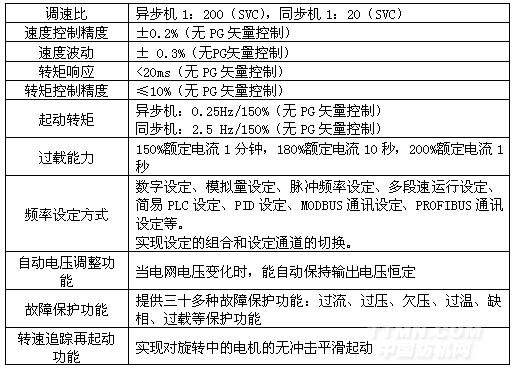 Goodrive300變頻器是深圳市英威騰電氣股份有限公司新開發(fā)的一款高性能開環(huán)矢量變頻器,具有V/F和無PG矢量兩種控制模式,其中在突加減載荷的情況下,速度波動非常輕微;可支持永磁同步電機、變頻器電機、直驅電機等,可以為用戶減少庫存,不再需要為不同的電機備用不同變頻器的庫存;具有準確的電機參數(shù)自學習功能,支持旋轉自學習與靜態(tài)自學習,其中靜態(tài)自學習可以在電機無法脫開負載的場合準確的學習電機的參數(shù);具有先進的全程三相調(diào)制方式,使電機運行更平穩(wěn),噪音更小;其他的特性參數(shù)、功能如下表所示: