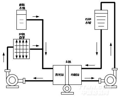 該部分由冷卻泵、冷卻水管道、冷卻水塔及冷凝器等組成。冷凍水循環(huán)系統(tǒng)進(jìn)行室內(nèi)熱交換的同時,必將帶走室內(nèi)大量的熱能。該熱能通過主機(jī)內(nèi)的冷媒傳遞給冷卻水,使冷卻水溫度升高。冷卻泵將升溫后的冷卻水壓入冷卻水塔(出水),使之與大氣進(jìn)行熱交換,降低溫度后再送回主機(jī)冷凝器(回水)。