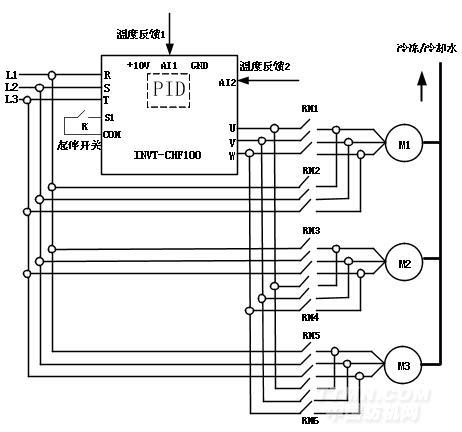 分別在主機(jī)蒸發(fā)器回水處、冷凝器出水及回水處安裝溫度傳感器,實時檢測管網(wǎng)的溫度,以模擬信號(0~10V或者4~20mA)反饋給變頻器,通過變頻器內(nèi)置的PID運算輸出相應(yīng)的頻率指令后自動調(diào)節(jié)水泵轉(zhuǎn)速,從而調(diào)節(jié)各循環(huán)水的熱交換速度,最終實現(xiàn)對室內(nèi)恒溫度的控制。需要特別說明的是,變頻器內(nèi)部在設(shè)計上集成了溫差反饋處理功能,系統(tǒng)無須另配專用控制模塊。