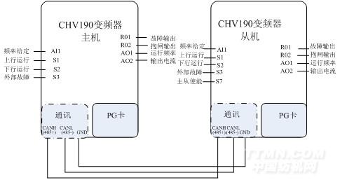 英威騰CHV190中壓變頻器已經(jīng)成功運(yùn)用于山西某煤礦兩臺電機(jī)驅(qū)動的帶式輸送機(jī)上,兩臺電機(jī)各驅(qū)動一個(gè)滾筒。驅(qū)動兩臺電機(jī)的兩臺CHV190變頻器之間采用主從功率均衡模式,一臺變頻器為主機(jī),另一臺變頻器為從機(jī)。要求兩臺電機(jī)輸出功率基本相同。