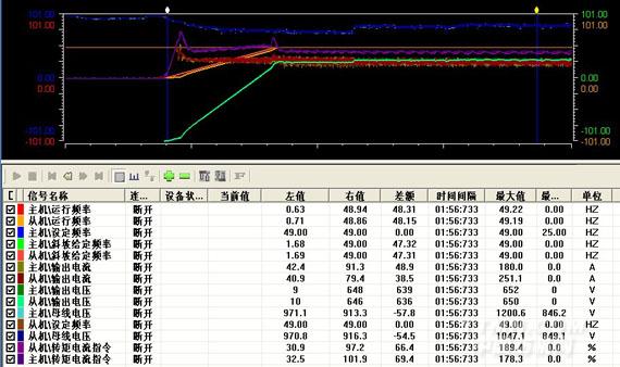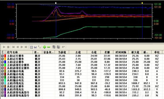 此次CHV190中壓變頻器在雙滾筒分別驅(qū)動帶式輸送機(jī)上的應(yīng)用,主機(jī)傳給從機(jī)的信號,采用了轉(zhuǎn)矩信號和電流信號,兩者都能實(shí)現(xiàn)功率均衡效果。從機(jī)在采用速度控制模式下,完全能滿足現(xiàn)場帶式輸送機(jī)的運(yùn)行要求,運(yùn)行穩(wěn)定。完全到達(dá)了帶式輸送機(jī)的運(yùn)行要求和用戶的要求。具體效果分析如下: