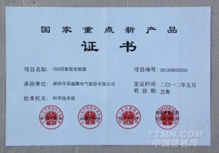 近日,我司CHA系列四象限變頻器因創(chuàng)新性強(qiáng)、技術(shù)含量高,擁有自主知識(shí)產(chǎn)權(quán),且產(chǎn)品性能優(yōu)良,產(chǎn)業(yè)化前景良好,對(duì)行業(yè)共性技術(shù)有較大帶動(dòng)作用,成功入選“國家重點(diǎn)新產(chǎn)品計(jì)劃”,并獲得由國家科技部、商務(wù)部、環(huán)境保護(hù)部、質(zhì)量監(jiān)督檢驗(yàn)檢測(cè)總局聯(lián)合頒發(fā)的“國家重點(diǎn)新產(chǎn)品”證書。
