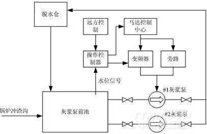灰漿泵是根據(jù)前池液面的高度決定啟、停電機(jī)。這樣就存在兩方面問(wèn)題:一方面為了適應(yīng)生產(chǎn)工藝要求,需要每天根據(jù)前池液位和沖灰管的需要不斷切換、啟停電機(jī),前池液位高度得不到很好控制,而且頻繁工頻啟動(dòng)電機(jī)對(duì)電機(jī)造成很大沖擊。灰漿泵工藝流程圖如下圖3所示: