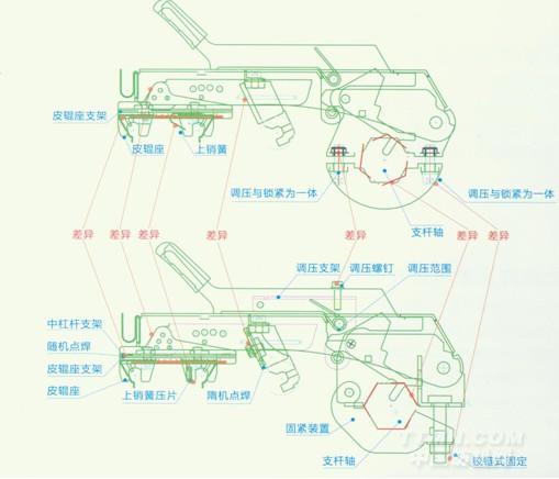 三、搖架中皮輥握持處沒有上銷簧調(diào)壓片,根據(jù)紡紗工藝的需要有四檔壓力可以選擇。
