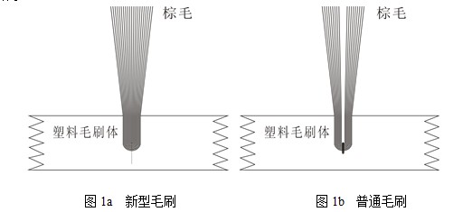新型毛刷采用熱植技術(shù),在植毛過(guò)程中將棕毛、釘子、毛刷體結(jié)合為整體。在抗拉測(cè)試中,即使把棕毛拉斷也不會(huì)使其從毛刷體中拔出,棕毛與毛刷體結(jié)合的非常牢固,所以在使用中無(wú)脫毛、掉毛現(xiàn)象(如圖1a所示)。