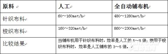 產(chǎn)量大 人工鋪布,4個人一天能鋪約800層;全自動鋪布機(jī)一個人操作能完成1000層以上。工作效率是人手的4倍-6倍以上。