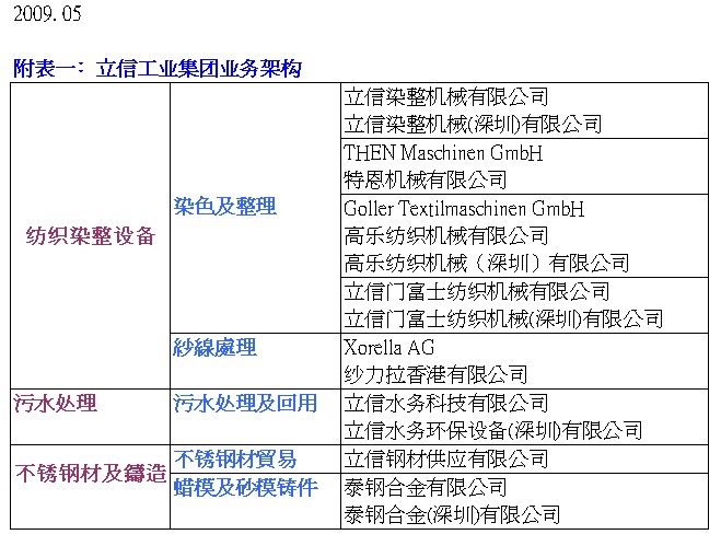 立信工業(yè)有限公司(“立信工業(yè)”)創(chuàng)辦于1963年,為香港聯(lián)合交易上市企業(yè)。公司以集團(tuán)形式經(jīng)營(yíng)(見附表一),旗下公司成員包括立信染整、特恩、高樂、紗力拉、立信門富士、立信水務(wù)、立信鋼材和泰鋼合金,主要業(yè)務(wù)為生產(chǎn)和銷售紡織染整設(shè)備、經(jīng)營(yíng)不銹鋼材貿(mào)易以及生產(chǎn)和銷售不銹鋼鑄件。