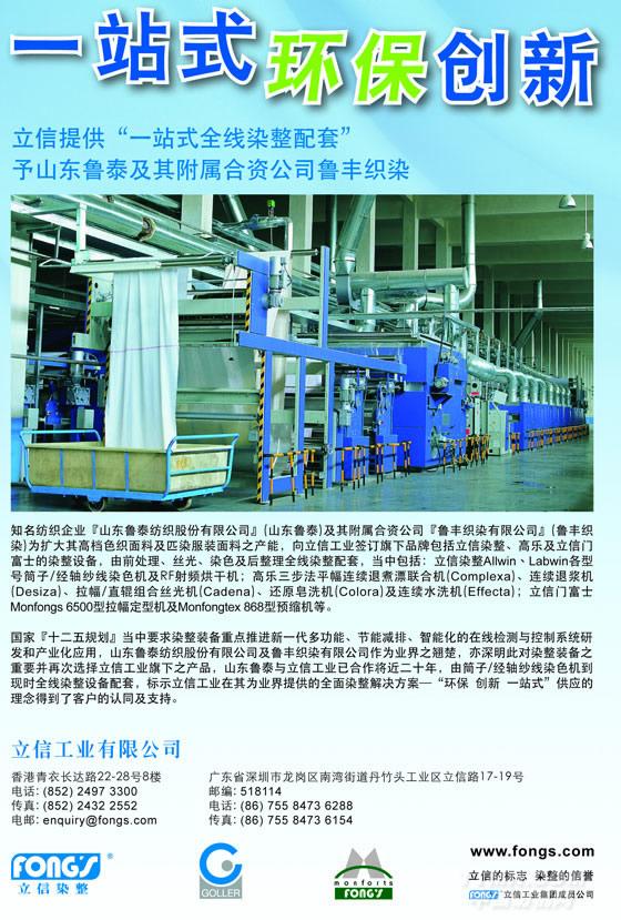 知名紡織企業(yè)『山東魯泰紡織股份有限公司』(山東魯泰)及其附屬合資公司『魯豐織染有限公司』(魯豐織染)為擴(kuò)大其高檔色織面料及匹染服裝面料之產(chǎn)能,向立信工業(yè)簽訂旗下品牌包括立信染整、高樂及立信門富士的染整設(shè)備,由前處理、絲光、染色及后整理全線染整配套,當(dāng)中包括:立信染整Allwin、Labwin各型號筒子/經(jīng)軸紗線染色機(jī)及RF射頻烘干機(jī);高樂三步法平幅連續(xù)退煮漂聯(lián)合機(jī) (Complexa)、連續(xù)退漿機(jī)(Desiza)、拉幅/直輥組合絲光機(jī) (Cadena)、還原皂洗機(jī) (Colora)及連續(xù)水洗機(jī) (Effecta);立信門富士Monfongs 6500型拉幅定型機(jī)及Monfongtex 868型預(yù)縮機(jī)等。