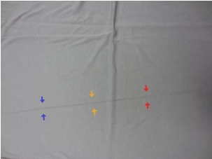 色折痕,又稱行機(jī)痕,水痕,直條痕等(見圖一)。主要是因?yàn)榭椢镌谌緳C(jī)繩狀運(yùn)行時,經(jīng)向折迭部分長時間沒有換位,造成起折部分顏色比其它部分偏深所致。組織結(jié)構(gòu)比較緊密的平紋布最容易出現(xiàn)此問題。近年來,一方面隨著針織織機(jī)技術(shù)的飛速發(fā)展,織物的密度越來越高;另一方面隨著紡紗技術(shù)的發(fā)展,質(zhì)量較差的紗也經(jīng)過提高紡紗捻度等用作織造。這樣前道工序中過多的內(nèi)應(yīng)力帶到后序染整加工來,造成織物收縮不一致,織物在運(yùn)行中折迭部分不易換位,最終導(dǎo)致色折痕的產(chǎn)生。