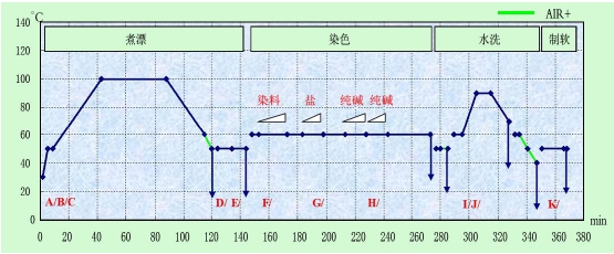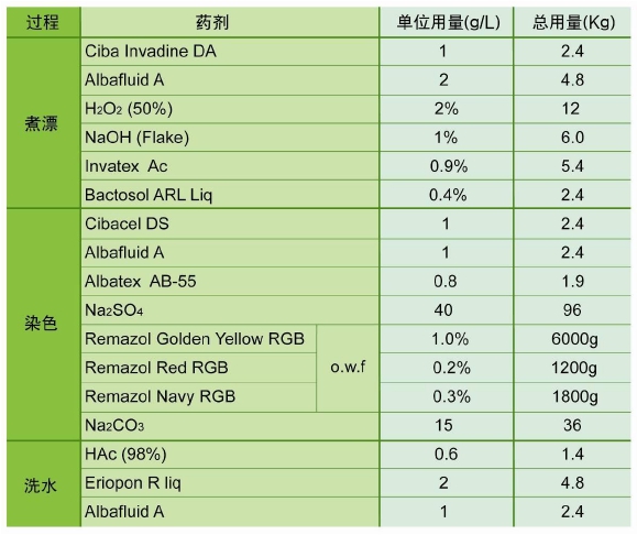 應(yīng)客戶要求,處染 600kg 全棉 32S/2 平紋布,米克重 300g/m ,幅寬 248cm,軍綠色。在立信 JUMBOTEC 處染,使用大流量噴嘴設(shè)定,浴比為 1:4。