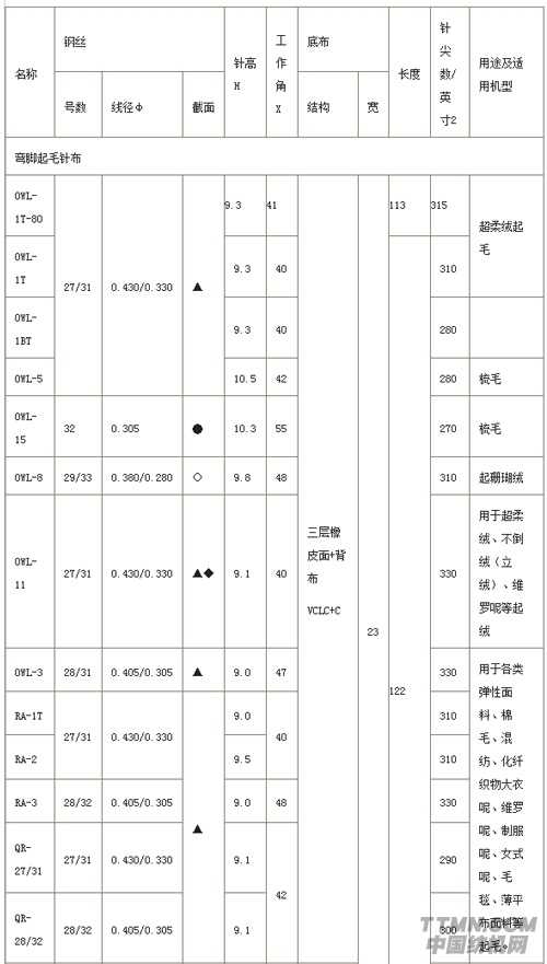 其中,彎角起毛針布共有OWL-1T-80、OWL-1T、OWL-1BT、OWL-5等十七種型號,