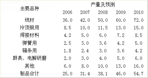 我國不銹鋼絲品種按用途可分20多種,主要有冷頂鍛、彈簧、焊接、易切削、金屬網(wǎng)、醫(yī)療、纖維、繩用、電解研磨、廚具、輻條用等。冷頂鍛用量最大,約占25%~30%;其次為焊接用,約占15%,彈簧用約占8%,民用廚具、輻條、電解研磨等是發(fā)展較快的品種,占10%~15%。預(yù)計(jì)到2010年,我國鋼線材產(chǎn)量將達(dá)到72萬t,線材制品將達(dá)55萬t,具體情況如表所示。