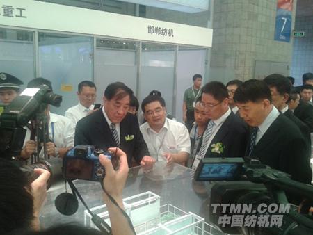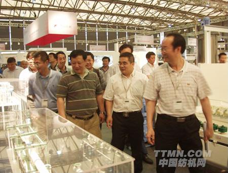中國紡織協(xié)會(huì)會(huì)長王天凱(前右四)、中國恒天集團(tuán)公司董事長、黨委書記張杰(前右二)與公司董事長總經(jīng)理杜榮念(前右三)蒞臨展位視察指導(dǎo)