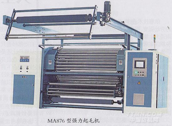 MA876型強力起毛機專用于不倒絨、超柔絨、緯編革基布、經(jīng)緯編麂皮絨、短毛絨等對起毛力要求高的織物起毛。該機機電一體化程度高,采用人機界面、PLC、變頻器實現(xiàn)全機傳動,特別是起毛力實時檢測和控制技術(shù)的應(yīng)用,真正達到了工藝的再現(xiàn)性:針輥傳動三角帶輪的支承方式采用專利技術(shù)的卸荷式結(jié)構(gòu),改善了軸頭的受力情況,徹底解決了軸頭斷裂問題;采用旋轉(zhuǎn)可調(diào)包角式擴幅輥(專利技術(shù)),對不同織物可調(diào)節(jié)不同包角大小,多種走布路線還可以調(diào)節(jié)對織物正面、反而的不同擴幅要求,達到更好的擴幅效果:有糾偏歸中,缺布自停,翻布部件、靜電消除等多種多種選用部件,可減少操作員工配置,提升效率。
