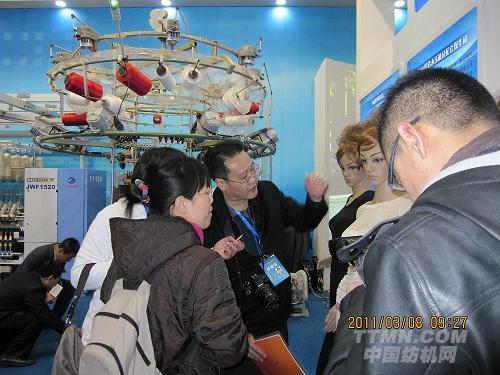 圖為協(xié)會領(lǐng)導(dǎo)向參觀者介紹無縫內(nèi)衣機