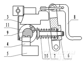 其次原有搖架外殼為鈑金件折彎成型而成,造成內(nèi)部折彎處圓角較大,在加壓時(shí),由于中間有間隙,在加壓一段時(shí)間后,造成零件加壓不穩(wěn)定。FA387搖架改為組裝式,上平面改為鋼材8mm,加壓后零件不變形,加壓穩(wěn)定。將彈簧裝進(jìn)殼體里,調(diào)節(jié)壓力方便,性能穩(wěn)定。同時(shí)搖架改為加壓式支撐,搖架可停放在任意位置,利于擋車工操作。