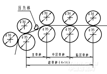 FA387型高速并條機(jī)的牽伸形式為四上四下附導(dǎo)向皮輥、壓力棒式雙區(qū)曲線牽伸。這種牽伸是一種新型的牽伸形式。與三上三下壓力棒式新型曲線牽伸結(jié)構(gòu)相比,突出的特點(diǎn)是中區(qū)的牽伸倍數(shù)設(shè)計(jì)為接近于1的略有張力的固定牽伸。這種裝置改善了前區(qū)的后膠輥和后區(qū)的前膠輥的工作條件,使前區(qū)的后膠輥主要起握持作用,后區(qū)的前膠輥主要起牽伸作用,改善了牽伸過(guò)程中的受力狀態(tài)。因此,在相同的牽伸系統(tǒng)制造精度條件下,對(duì)須條可獲得較好的握持效果,利于穩(wěn)定條干質(zhì)量。另一方面,須條經(jīng)后區(qū)牽伸后,進(jìn)入牽伸倍數(shù)接近于1的中區(qū),可起穩(wěn)定作用,給進(jìn)入更大倍數(shù)的前區(qū)牽伸做好準(zhǔn)備。如圖: