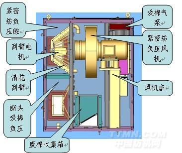 結構特點:更換原機車尾風機箱,在風機箱內部增加緊密紡負壓腔、緊密紡負壓濾網、緊密紡負壓風機、風機座等部件,用戶并可選配自動清花裝置,以自動清理緊密紡負壓腔內濾網上的積花,保證運轉過程中負壓均勻一致。