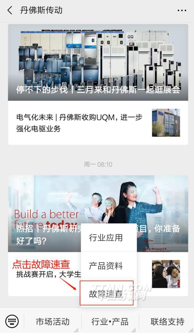 1.在丹佛斯傳動公眾號菜單欄,點(diǎn)擊【行業(yè)·產(chǎn)品】,選擇“故障速查”,即可進(jìn)入故障速查首頁。