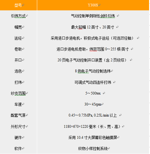 Y300S型自動劍桿織樣機是與無梭織機相配套的新一代織樣機設備,關鍵部件均采用進口件。經(jīng)紗上機長度和梭口形狀、尺寸按新劍桿織機等比例縮放,解決了小樣和批量產(chǎn)品之間的差異。適應棉、毛、絲、麻、化纖、混紡等各類織物的小樣試織和產(chǎn)品開發(fā)。