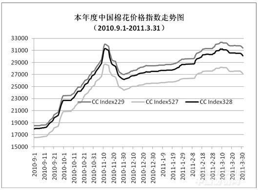 3月國內(nèi)棉花現(xiàn)貨市場先漲后跌。上旬受國際價(jià)格、紡織企業(yè)補(bǔ)庫、棉商惜售等因素影響,持續(xù)小幅上漲;中旬后,日本地震引發(fā)大宗商品市場全面回落,國內(nèi)外期貨行情大幅波動(dòng)回落,對現(xiàn)貨市場形成壓力,加之紡織企業(yè)經(jīng)營狀況不佳,原料采購更趨謹(jǐn)慎,國內(nèi)棉花價(jià)格不斷下滑,月末已低于月初水平,但月均價(jià)環(huán)比仍上漲近千元。其中CCIndex328級月均價(jià)30733元/噸,較2月上漲938元/噸,漲幅3.1%,較去年同期上漲15172元/噸,漲幅98%;CCIndex229級月均價(jià)32630元/噸,環(huán)比上漲1211元,同比上漲16467元。CCIndex527級均價(jià)為27771元/噸,環(huán)比上漲605元,同比上漲13303元。