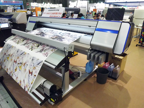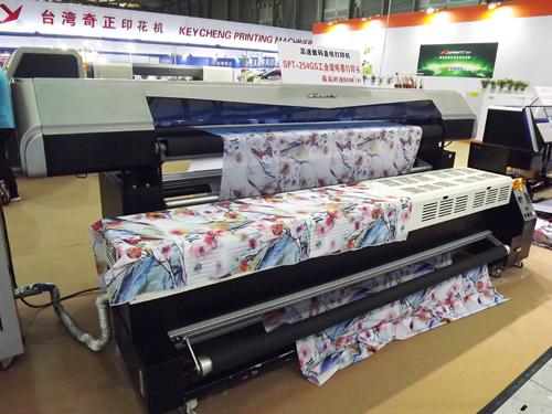 飛揚(yáng)聯(lián)合展臺上的高速數(shù)碼直噴打印機(jī),提供整套平網(wǎng)數(shù)碼印花解決方案,其FY-1816工業(yè)數(shù)碼紡織印花機(jī),最高時速可達(dá)80M2/H。