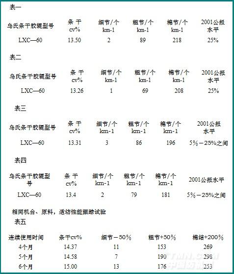 2.2 LXC—60屬軟彈膠輥,我們?cè)贑18.2tex紗上適用,我們本著先小試一中試再大試的原則,作好質(zhì)量記錄,便于及時(shí)總結(jié)經(jīng)驗(yàn),擴(kuò)大生產(chǎn)。