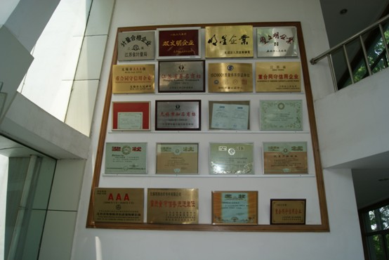 一進(jìn)辦公大樓,無錫明珠紡織專件有限公司的榮譽(yù)墻引人注目。