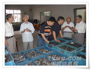 雙帆總經(jīng)理姜國海(右起第一位)和唐文輝教授(左起第一位)、張懷良副理事長(zhǎng)(左起第二位)參觀雙帆搖架用戶使用現(xiàn)場(chǎng)