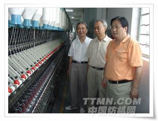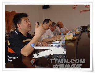雙帆總經(jīng)理姜國海向細(xì)紗牽伸理論專家唐文輝教授、張懷良副理事長(zhǎng)等介紹零部件的制造裝配精度