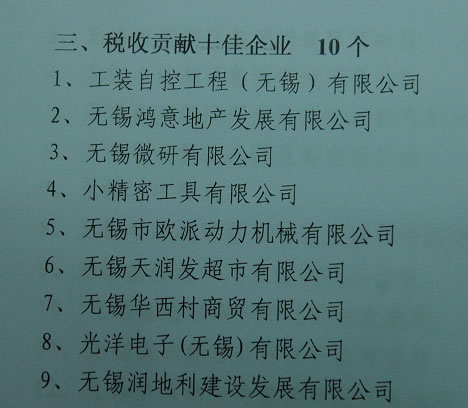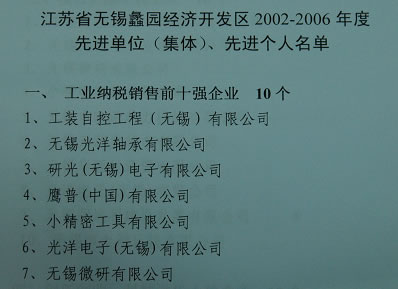 2007年6月16日下午江蘇省無錫市蠡園經(jīng)濟開發(fā)區(qū)成立十五周年慶祝表彰大會在無錫市蠡園中心小學(xué)隆重召開。我公司被蠡園經(jīng)濟開發(fā)區(qū)評為2002年至2006年度工業(yè)納稅銷售前十強企業(yè)及稅收貢獻十佳企業(yè)。公司員工顧竹青被蠡園開發(fā)區(qū)評為2002年至2006年度的先進工作者。