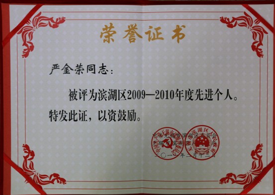 嚴總經(jīng)理被無錫市濱湖區(qū)人民政府評為2009-2010年度先進個人