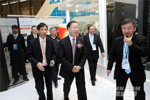 工業(yè)和信息化部副部長蘇波(前排中)在臺達集團創(chuàng)辦人暨董事長鄭崇華先生(右2)的陪同下參訪臺達展位
