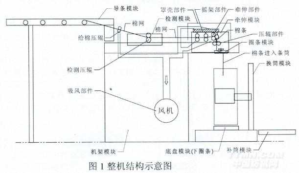 新機分為機架、吸風(fēng)、壓輥、圈條盤、壓輥、牽伸、搖架、罩殼、后檢測、導(dǎo)條、換筒、補筒及電控、氣動等十多個部件。