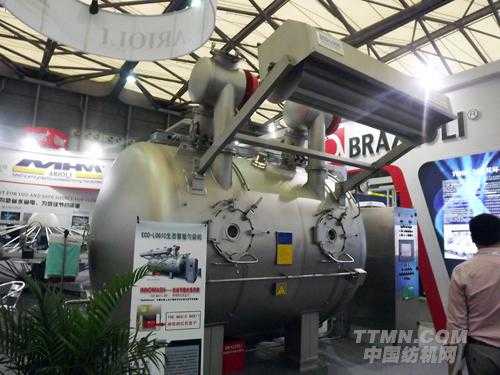 也可以正好介紹一下,我們這邊有一個雙環(huán)進布的一個技術(shù),就是說我們公司針對一個輕薄織物,它同時可以印兩個布環(huán),一條環(huán)流進兩個布環(huán)。因為有一些輕薄織物它的載量不夠,張力過大的情況下可能會對織物造成一個損傷,但是雙環(huán)進布以后它在增大載量的同時它,是不會犧牲這些所有的工藝,對張力有一個很好的緩解。這次我們主推的就是智能水洗系統(tǒng),它是通過水洗系統(tǒng)探頭來監(jiān)測染缸里的最低液位,然后達到節(jié)能減排的過程。我們可以看到,在這個電柜上的是歐盟頒發(fā)的綠色環(huán)保標志。印染行業(yè)一向是高污染高耗能的行業(yè),我們希望通過最先進的技術(shù)盡量把所有的這排污阿 、能耗降到最低,力爭達到零排放。我們來后面看下。