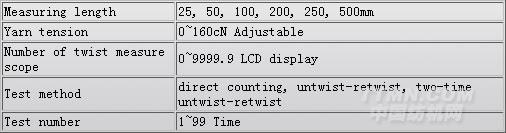 Used for testing the number of twist, twist uneven rate for yarn such as cotton, wool, linen, silk, chemical fiber and so on. The number of teist and twist take-up for compound yarn. The data has been treated by microcomputer and displayed in LCD.