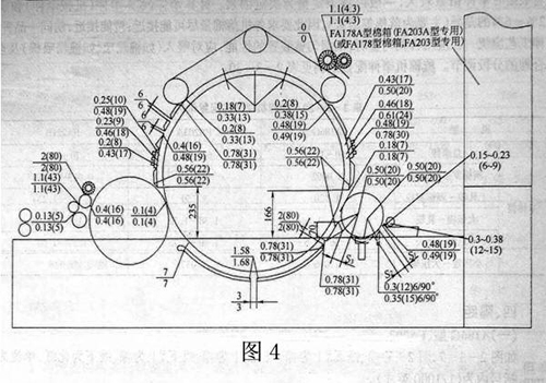 (4)錫林~蓋板隔距:根據(jù)紡紗號數(shù)、機(jī)械狀態(tài)等因素確定。