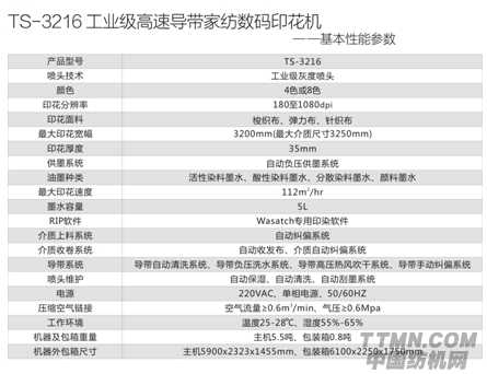 TS3216工業(yè)級高速導(dǎo)帶家紡數(shù)碼印花機(jī)的基本性能參數(shù)