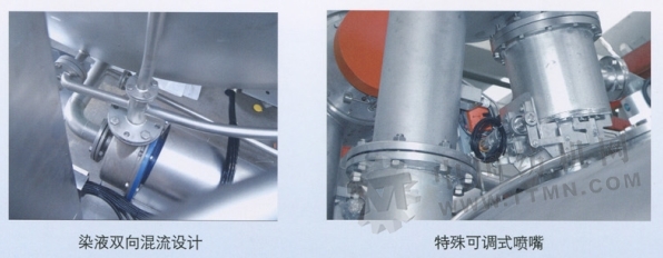 特殊可調(diào)式噴嘴:可選擇不同的液流模式,適臺不同克重織物加工,提高染色機(jī)的靈活性。